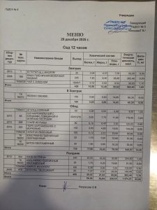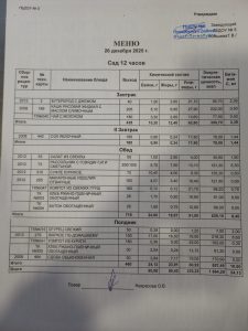 В каждой группе вывешивается меню на каждый день, подписанное заведующим детским садом. Меню сбалансировано по белкам, жирам, углеводам, выведены калории.