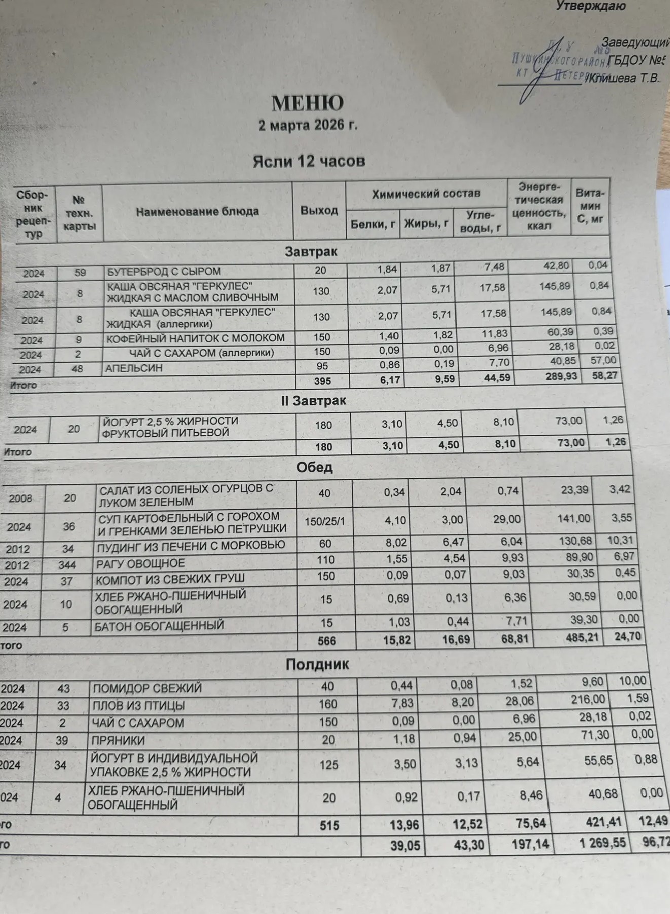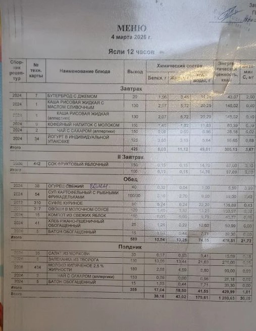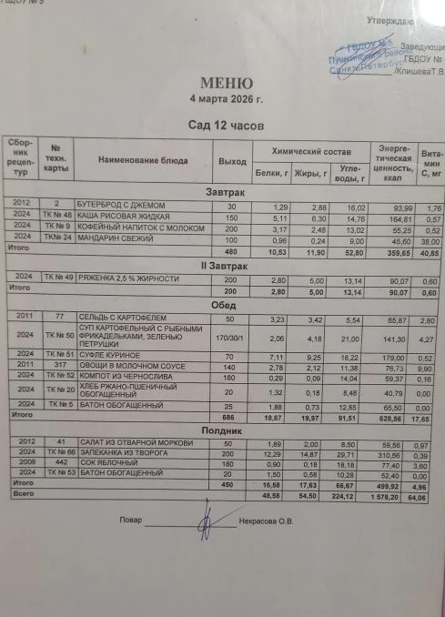 В каждой группе вывешивается меню на каждый день, подписанное заведующим детским садом. Меню сбалансировано по белкам, жирам, углеводам, выведены калории.