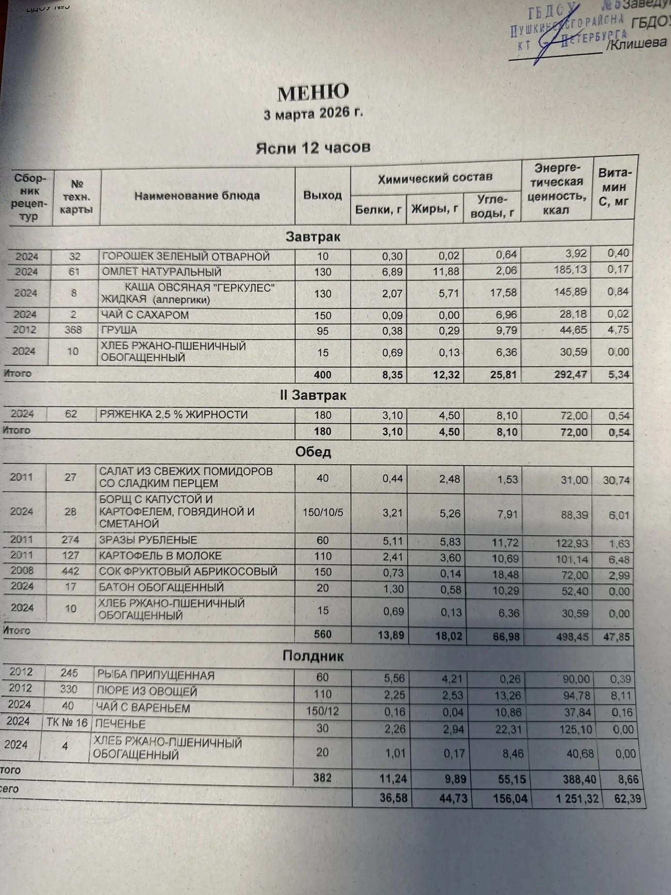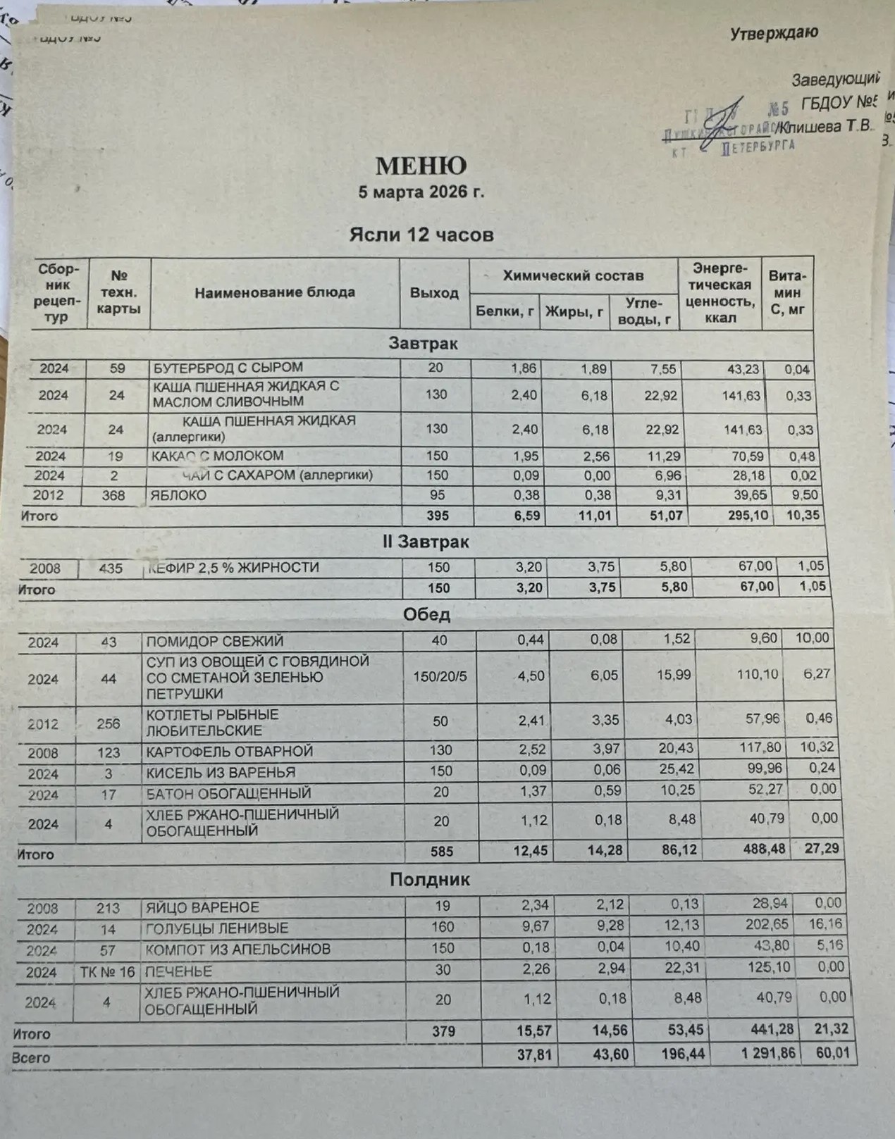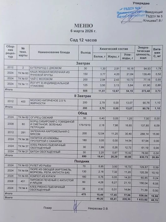 Ежедневное меню ГБДОУ № 5 для детей от 3 до 7 лет с 12 часовым пребыванием